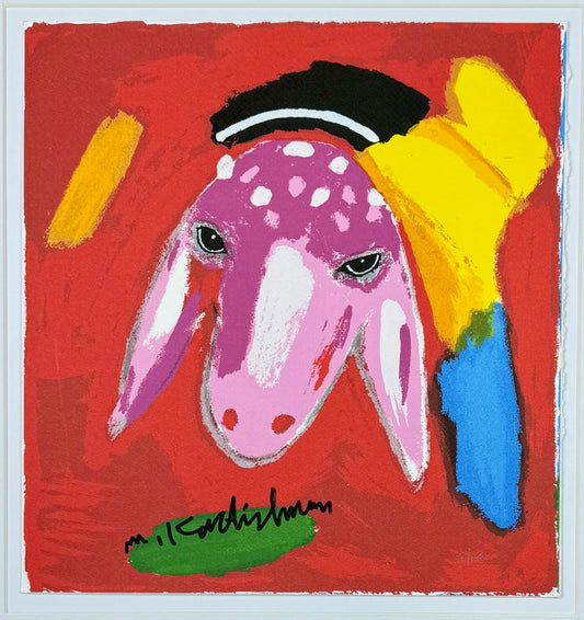 ליטוגרפיה מקורית חתומה ביד וממוספרת - מנשה קדישמן, "דיוקן כבשה על רקע אדום"